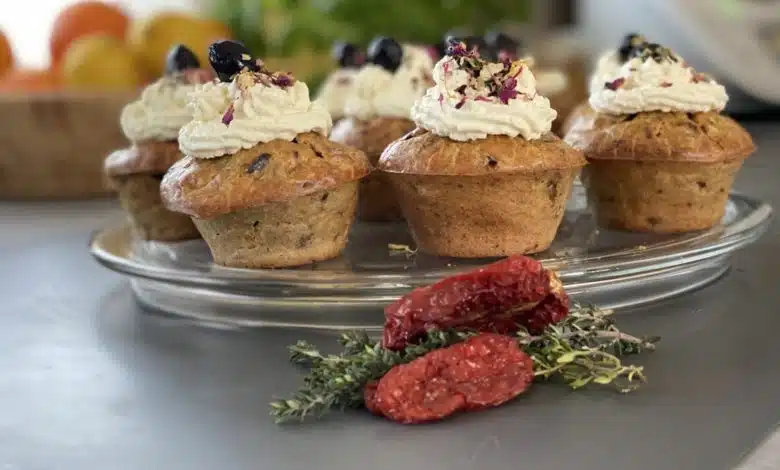 Die Creme in einen Spritzbeutel mit Sterntülle füllen und Creme Häubchen auf die Cupcakes setzen. Damit die Creme Häubchen nicht schmelzen, sollten die Cupcakes dafür abgekühlt sein. Nun auf jeden Cupcake mit Haube eine Olive setzen und mit ein paar Kräutern oder gerne auch mit getrockneten oder frischen Blüten dekorieren. Dafür eignen sich unter anderem Lavendel, Bio-Hornveilchen, Tagetis, Kapuzinerkresse, Schnittlauch, Rosen, Veilchen und auch Zucchiniblüten.